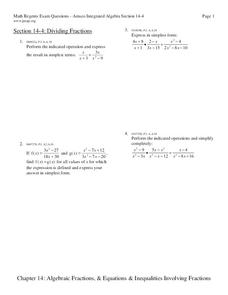 In this Algebra I/Algebra II learning exercise, students multiply and divide algebraic fractions. The one page learning exercise contains four free response questions. Answers are included.