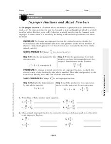 In this improper fraction and mixed number worksheet, students learn how to convert from an improper fraction to a mixed number and from a mixed number to an improper fraction. They practice converting from one to the other.