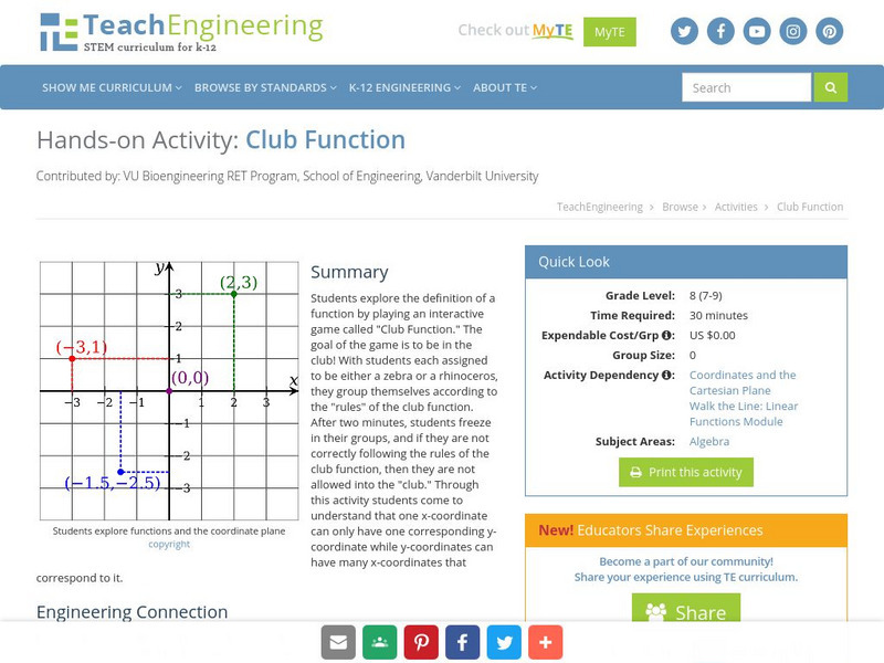 Students explore the definition of a function by playing an interactive game called "Club Function." The goal of the game is to be in the club! With students each assigned to be either a zebra or a rhinoceros, they group themselves...