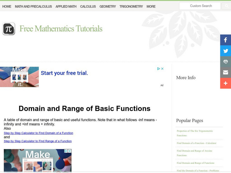 Learners examine a table of domain and range for basic functions. The tutorial includes the domain and range of algebraic, trigonometric, inverse trigonometric, hyperbolic, and logarithmic functions.