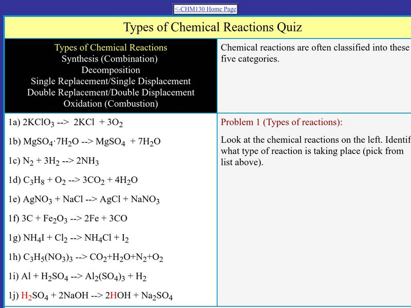 Seven problem online chemistry quiz that tests understanding of the five categories of chemical reactions.