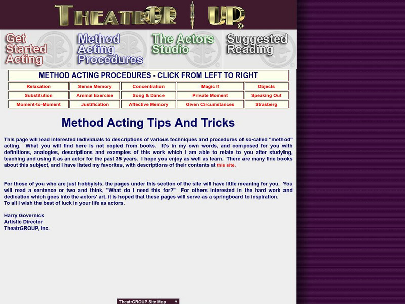 Contains fourteen descriptions of various "method" acting procedures. Includes exercises such as sense memory, the magic if, animal exercise, affective memory, given circumstances, and more.