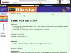 Students explore, experiment and study how the Earth orbits the Sun once a year and how the moon takes approximately 29 days to orbit the Earth. They access an online activity to examine the process of how the Sun is at the center of the...