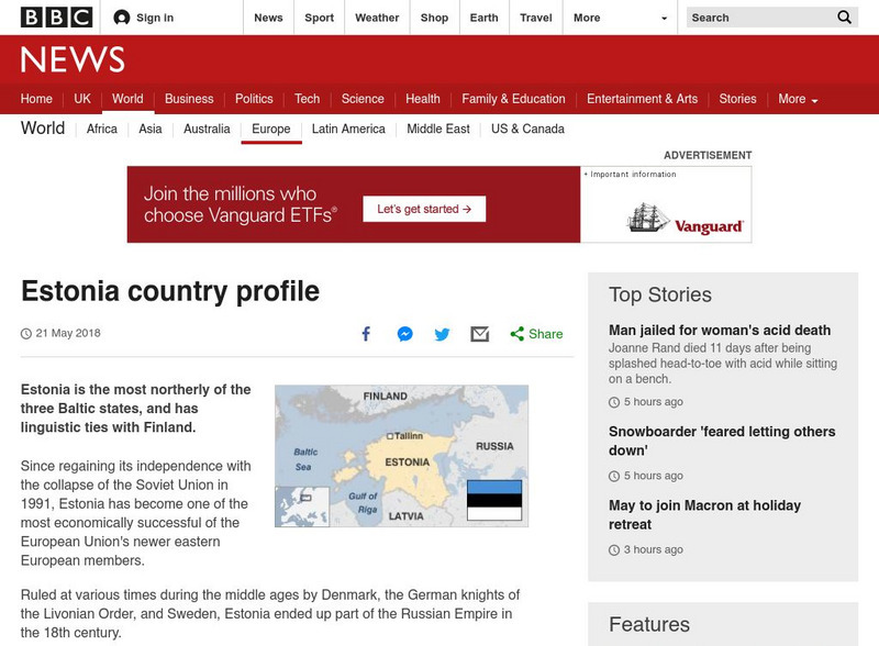 BBC News provides interesting details on the former Soviet Baltic republic of Estonia. Focus is on history, current information, country facts, political leaders, and news media. Provides links to a timeline of key events, recent news...