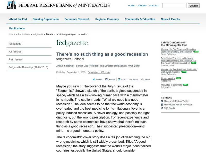 This article from the Federal Reserve Bank of Minneapolis discusses how a recession effects the economy. It goes into great detail on why a recession can never be a good thing. (Published Sept. 1, 1989)