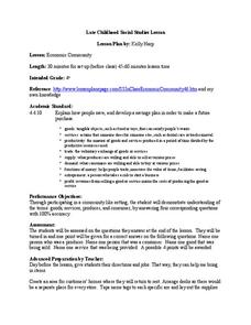 Fourth graders assume different jobs of a community and understand the terms goods, services, producer, and consumer. In this community lesson plan, 4th graders answer short answer questions to show their knowledge of the terms.