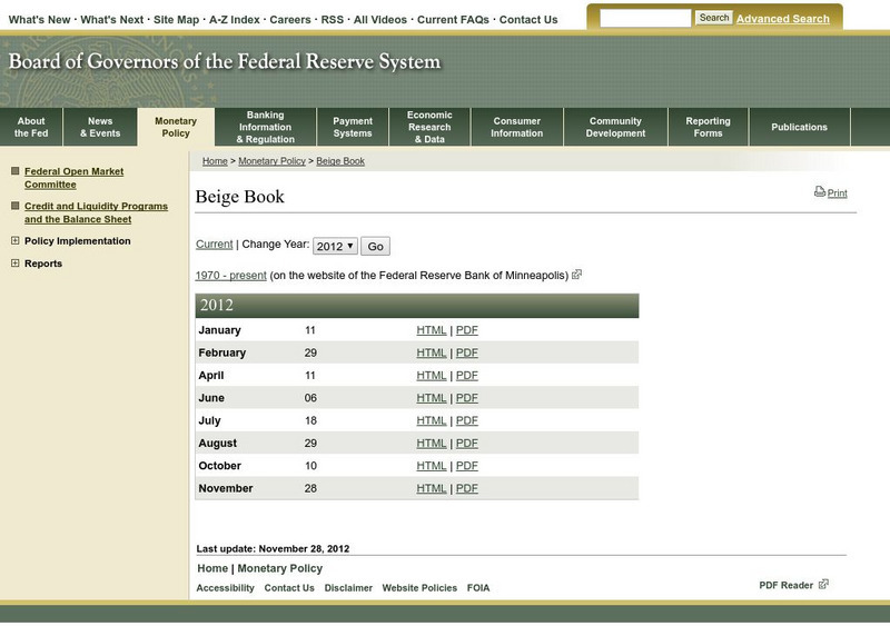 This page provides access to the Beige Book, published eight times per year. Each Federal Reserve Bank gathers anecdotal information on current economic conditions in its district through reports from bank and branch directors, and...