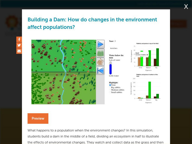 In this simulation, students build a dam in the middle of a field, dividing an ecosystem in half to illustrate the effects of environmental changes. They watch and collect data as the grass and then the rabbit populations in that region...