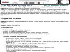 Ninth graders participate in experiments to investigate the the effects of nicotine, caffeine, aspirin, alcohol, and sleeping pills on the heart rates of Daphina. They describe the relationships between common drugs and heart rates....