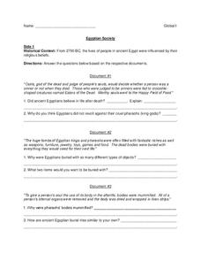 To derive an understanding of Egyptian culture and society, pupils read several excerpts from Egyptian texts. They will answer 10 comprehension questions and identify 5 different Egyptians based on the 1st person statement.
