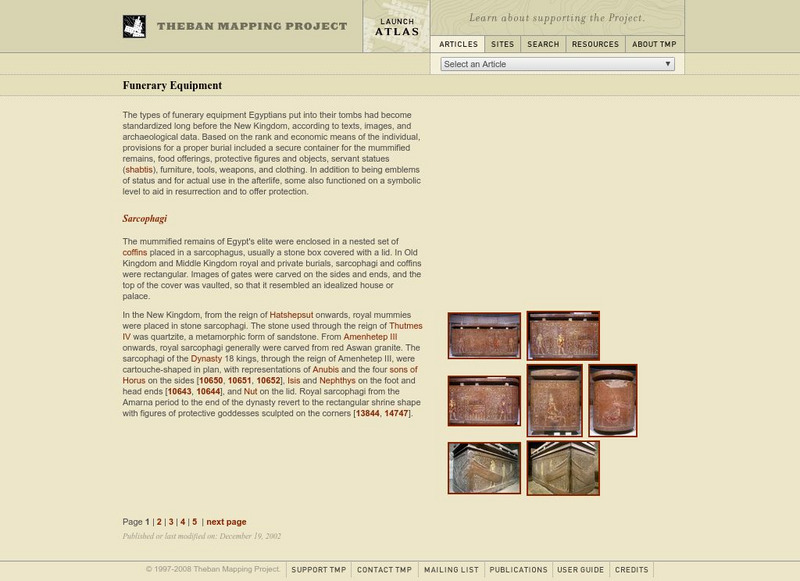 A five-page article dealing with the objects used in ancient Egyptian funerary practices. Details are given on the sarcophagi, coffins, shabtis and the like.