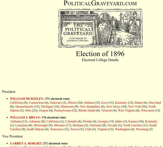 This page from The Political Graveyard just lists the electoral votes each candidate received in the 1896 election. Links to brief biographical listings about each candidate and elector.