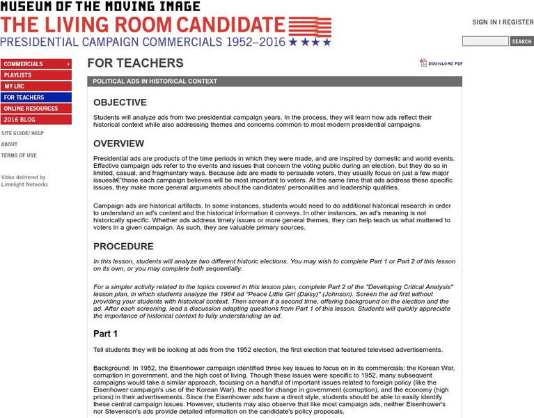 Campaign ads changed the course of presidential elections when introduced in 1952. By examining ads from the elections of 1952 and 1988, students will understand the historical issues specific to that time period and themes common to...