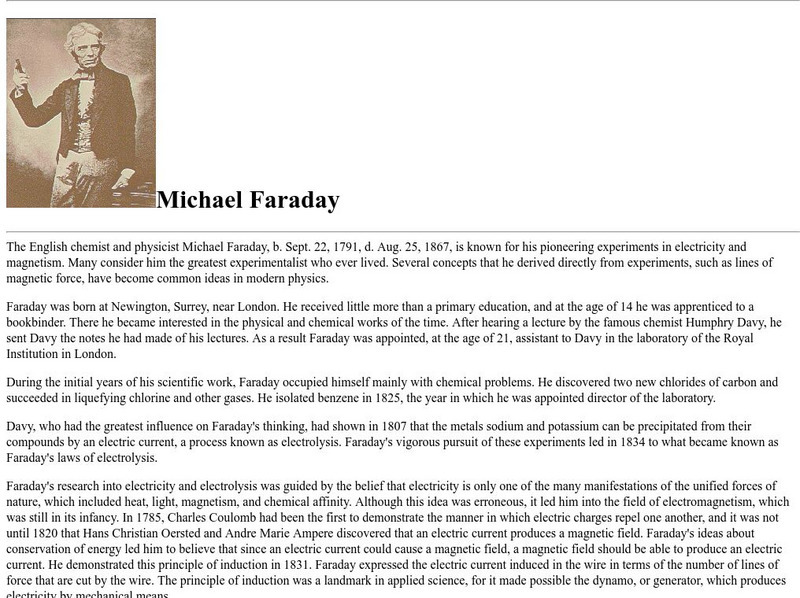 Provides information about the achievements of the English chemist and physicist Michael Faraday who is "known for his pioneering experiments in electricity and magnetism."