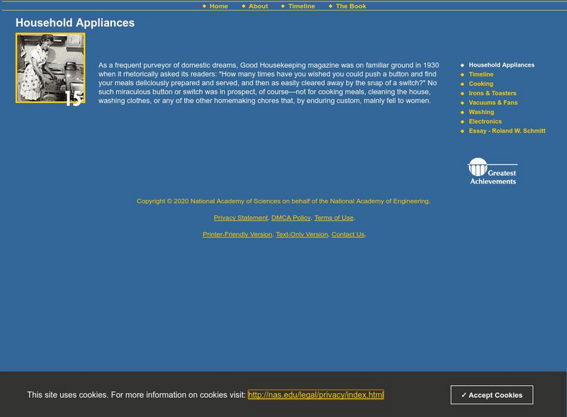 Learners investigate household appliances in the 20th century. Some topics explored are cooking, washing, and electronics. The resource consists of historical information, a timeline, and a personal essay by a key innovator.