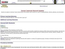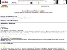 Fourth graders update their career interest record with their new attitudes, interests, aptitudes, and achievements.