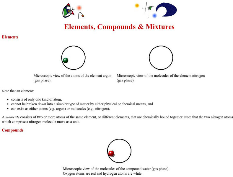 Provides definitions and characteristics of elements, compounds, and mixtures, and gives an animated image of each.