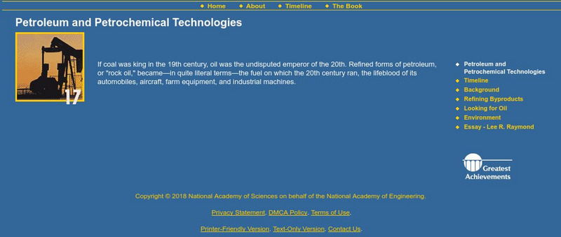 Learners investigate petroleum and petrochemical technologies in the 20th century. Some topics examined are the environment, oil, and refining byproducts. The resource consists of historical information, a timeline, and a personal essay...