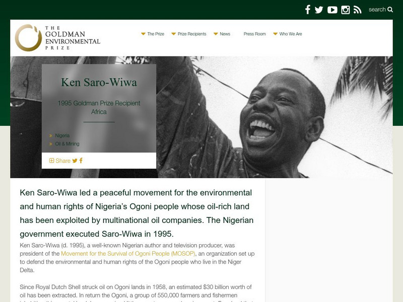 A biography of Goldman Environmental Prize recipient Saro-Wiwa which focuses on his political activities.