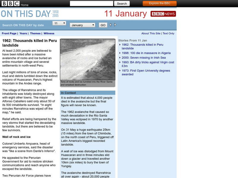 This BBC article reports on the natural disaster that occurred in Peru in 1962 when a massive avalanche destroyed towns and villages with tons of snow, rocks, and mud.