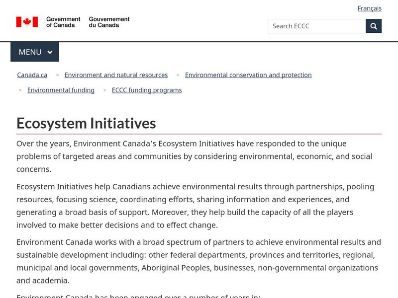 This resource provides information on ecosystem initiatives and the programs in Canada that are working to preserve area ecosystems.