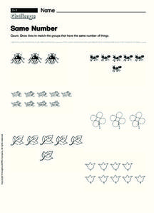 In this recognizing same numbers worksheet, students count objects and draw lines to match the groups with the same number of items. Students match three groups.