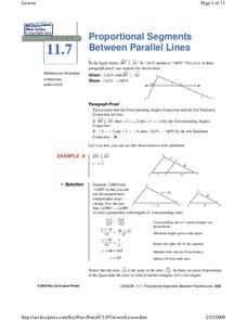 Students identify similar triangles. For this proportional segments lesson, students identify corresponding sides, set up ratios, and find the length of the missing side of a triangle. They use the parallel/proportionality...