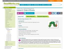 A series of hands-on activities follows a reading of The Very Hungry Caterpillar by Eric Carle. Learners create a paper collage to explore the beginning, middle, and end of days of the week, numbers, and more. They grow a butterfly...