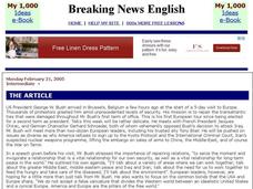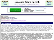 In this current world events worksheet, students read an article about Iran test-firing missiles and complete eight true or false questions, 10 synonym matching questions, 10 phrase matching questions, and a cloze activity based on the...