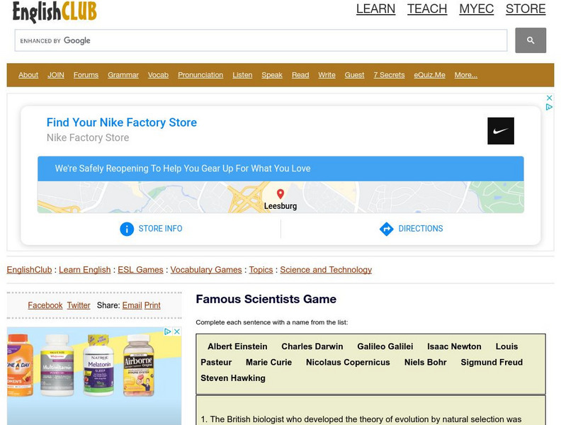 Choose from a word bank to complete ten sentences about famous scientists. Hints are available if needed, and a percentage score is displayed once answers are submitted.
