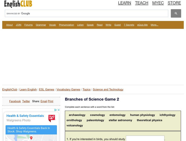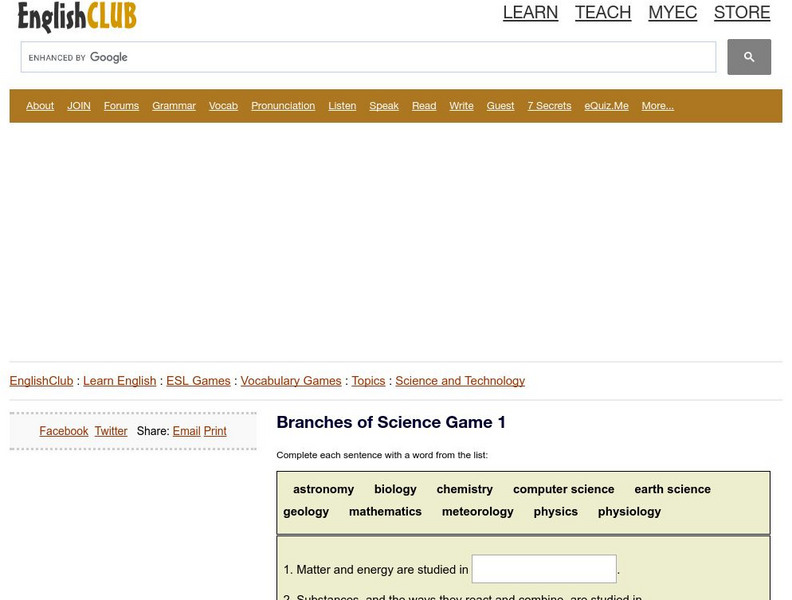 Choose from a word bank to complete ten sentences about the various branches of science. Hints are available if needed, and a percentage score is displayed once answers are submitted.