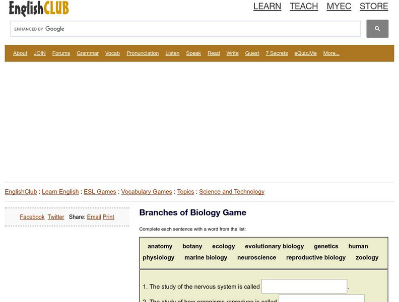 Choose from a word bank to complete ten sentences about the various branches of biology. Hints are available if needed, and a percentage score is displayed once answers are submitted.