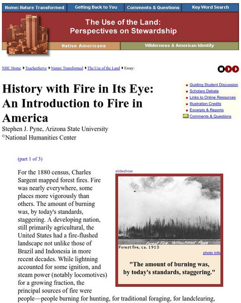 This site from the National Humanities Center provides an interesting look at the history of fire in America, how we use it to control natural resources and how it controls us.