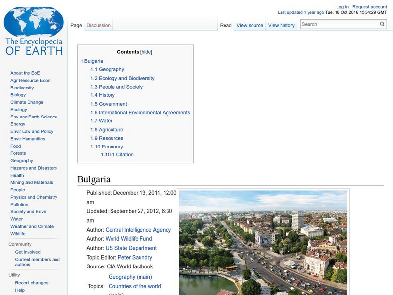 The Encyclopedia of Earth provides an overview of Bulgaria, including its geography, natural resources, history, government, economy, and much more. Maps and images are also included, along with sources used to create the entry.