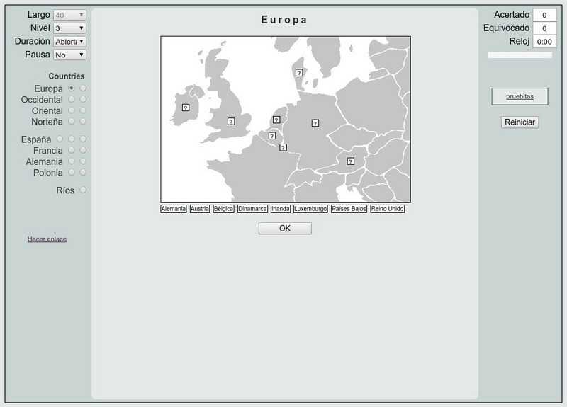 Interactive practice to learn the countries of Europe. It keeps track of right and wrong answers and the time in which it takes to identify the maps.