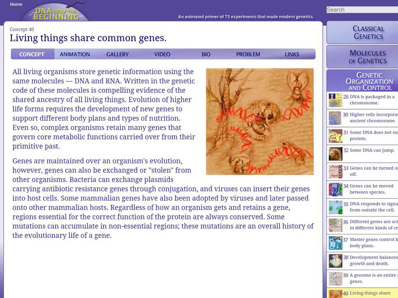 This multimedia article includes animations, pictures, video, biographical information, and quiz questions that are accessed by clicking on buttons along the bottom of the page. Here you can see how common genes are evidence for common...