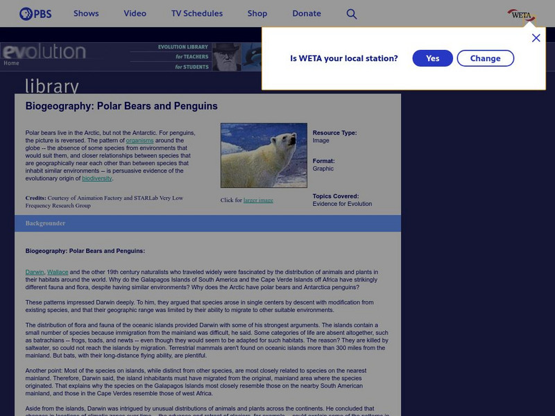 From the Evidence for Evolution Library at PBS, this is a short article about biogeography. The distribution of animals is one source of evidence for Darwin's descent with modification.