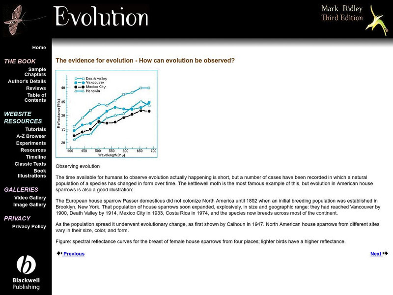 These pages are part of a site called "Evolution," that accompanies a textbook by the same name. Mark Ridley is the author. These pages are about the house sparrow and the differences that can be observed in it in different geographical...