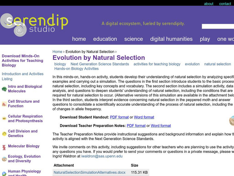 After looking at examples of natural selection and doing a simulation activity, students investigate further by playing a simulation game and analyzing the data they collect. They then examine evidence of natural selection for the...