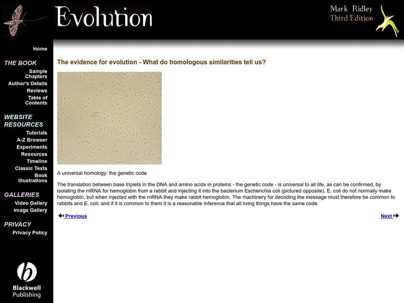 These pages are part of a site called Evolution that accompany a textbook by the same name. Mark Ridley is the author. In this section: the universal genetic code provides evidence that life has a common ancestor.