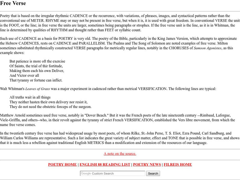 This page provides a good working definition of free verse, along with some examples, information about its development, and mention of the poets who have made it popular.