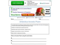 In this Antarctica poetry worksheet, students first read about how to write an acrostic poem. Students write an acrostic poem using the letters in ANTARCTICA. Each line of poetry will begin with the letters that are printed down in a...