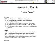 Young scholars create their own acrostic poems. In this poetry lesson, students read poetry book to view examples of acrostic poems. Young scholars then write an acrostic poem using their name.