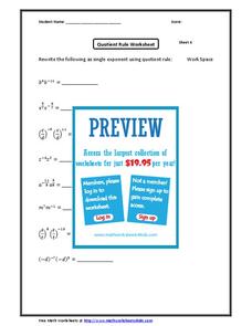 in this quotient rule worksheet, students use the quotient rule to write the problems given as single exponents. Students complete 8 problems.