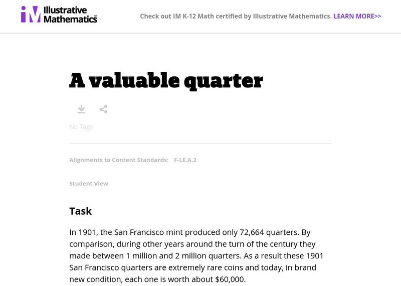 The context of this task is that a quarter was put into a bank account in 1901 and students are asked to calculate its value in 2013 at two different interest rates. Those amounts are compared to the appreciation rate of a rare and...