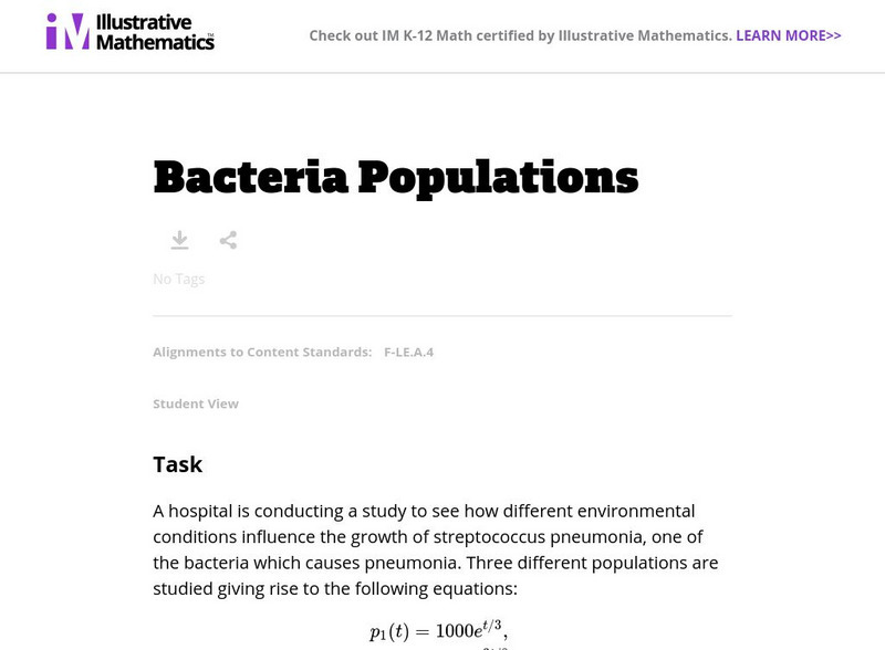 This task provides a real-world context for interpreting and solving exponential equations. Students are asked to examine the equations representing the growth of three colonies of the bacterium that causes pneumonia, each colony being...