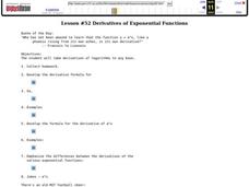 Students take derivatives of exponential functions. In this taking derivatives of exponential functions lesson, students prove the derivative of an exponential function is the exponential function. Students find derivatives...