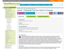 Distinguish between fact and opinions in this nonfiction reading lesson plan. Middle schoolers read 'The Diary of an Early American Boy' and work in groups to analyze the text. They record the facts and opinions for the text.