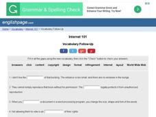 For this online interactive vocabulary skills worksheet, students answer 10 fill in the blank questions regarding Internet-related words. Students may submit their answers to be scored.