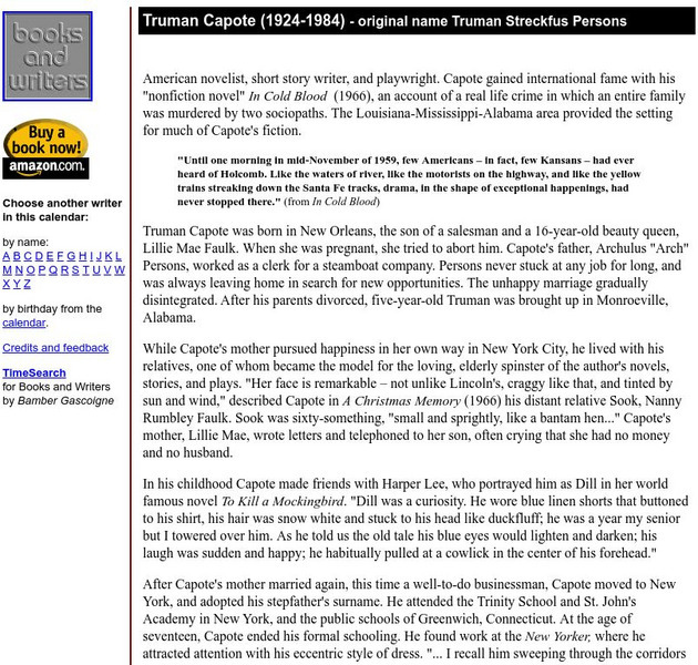 The creator of the "nonfiction novel," Truman Capote, who established his career as a Southern gothic writer, crossed the line between journalism and fiction. This biography provides his background and information about his writing and...